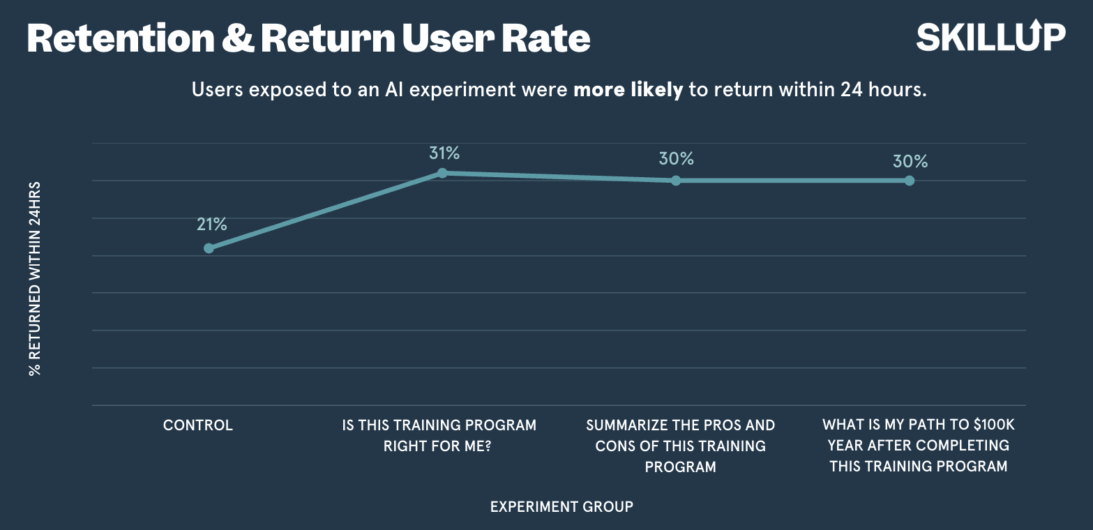 From survey follow-up, we estimate these gains led to a 13% increase in job attainment and a 15% increase in average wages, translating to $342K in lifetime earnings across the 1,500-user test group directly attributable to SkillUp’s AI intervention (and extrapolated across all SkillUp users, over 6,500 additional jobs worth over $250M in lifetime earnings).